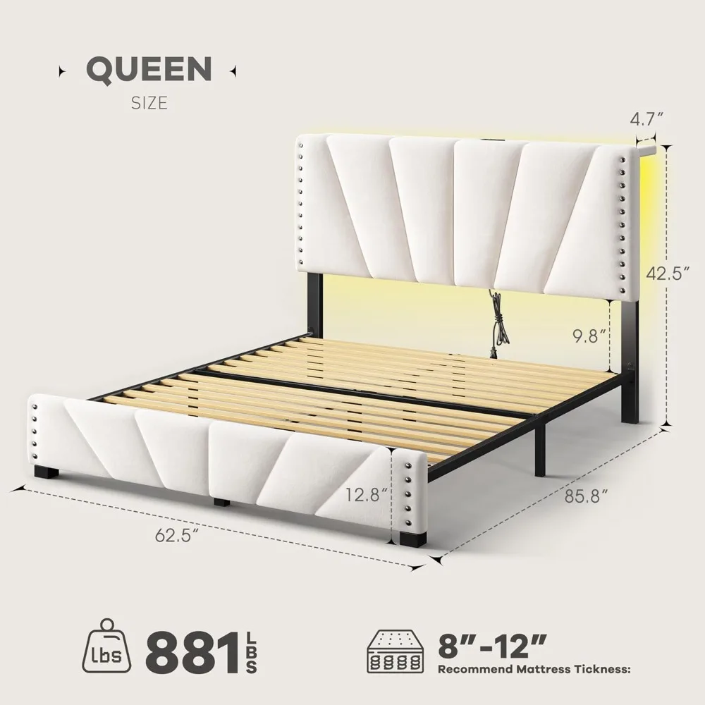 EnHomee Queen Bed Frame with Velvet Headboard and LED Lights, Storage Headboard with Charging Station, Bed Frame Queen Size with