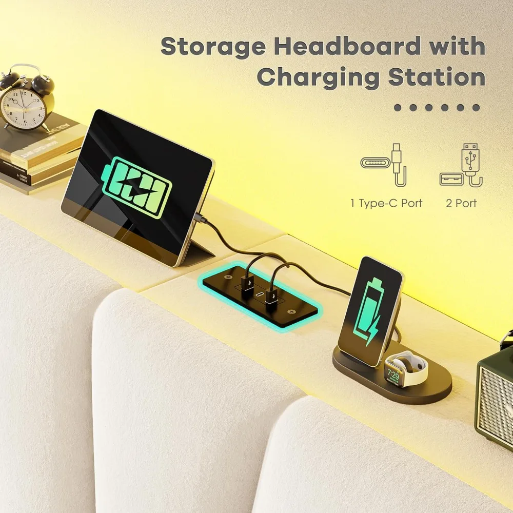 - LED Bed Frame: This queen bed frame with storage features RGB LED light strips on the headboard. Enjoy modes like music sync and timer to create a great atmosphere for your mood.